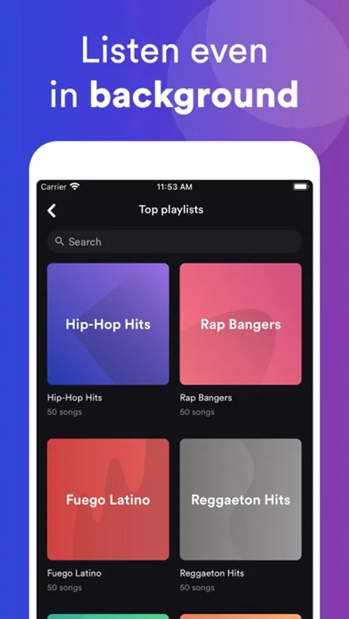 - Playlist maker with tons of different genres, moods, and other trending song categories to play: Pop, Rock, Rap, RnB, Latin, Dubstep, Drum, Electronic, etc.