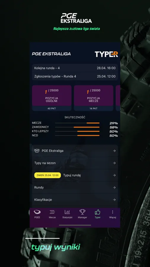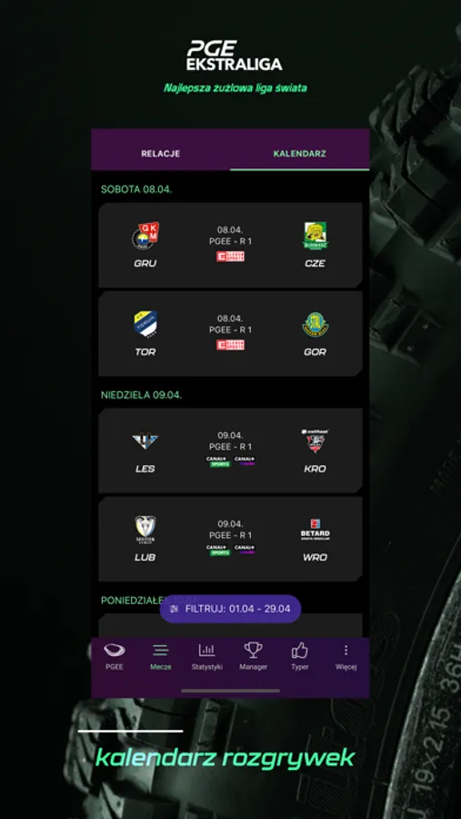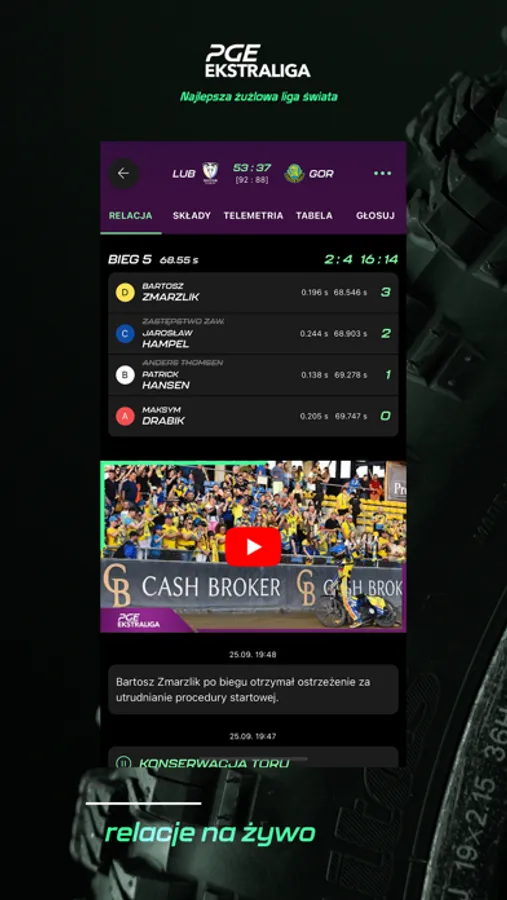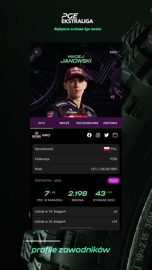 The application contains: LIVE matches in text, statistics, table, teams, video materials, photos, news, TV broadcast times and a calendar of all speedway events, ELIGA MANAGER game, interesting facts about teams and riders, Red Bull Juniors Aces, #TyperPGEE - typing game, Raider of the match, speedway programmes downloadable in PDF format.
