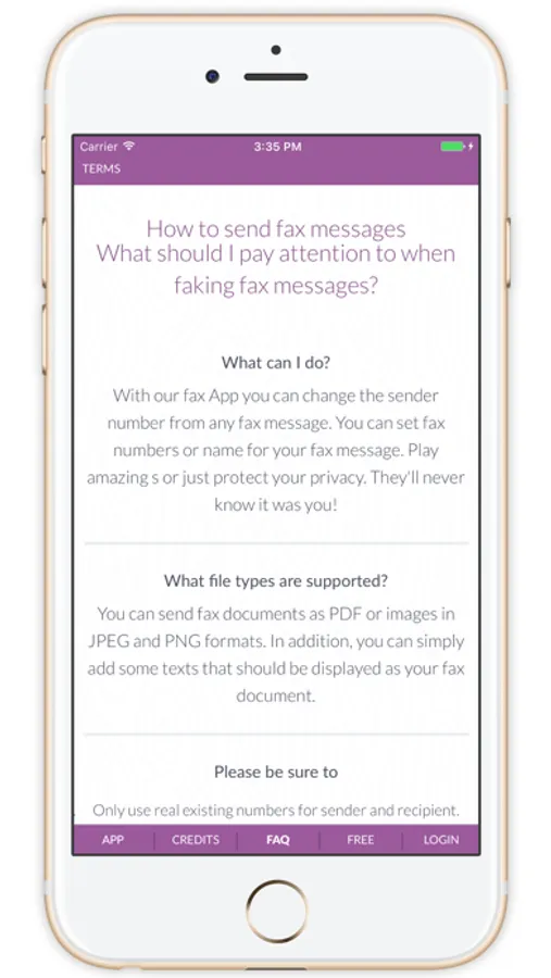 You can send fax documents as PDF or images in JPEG and PNG formats. In addition, you can simply add some texts that should be displayed as your private fax document.