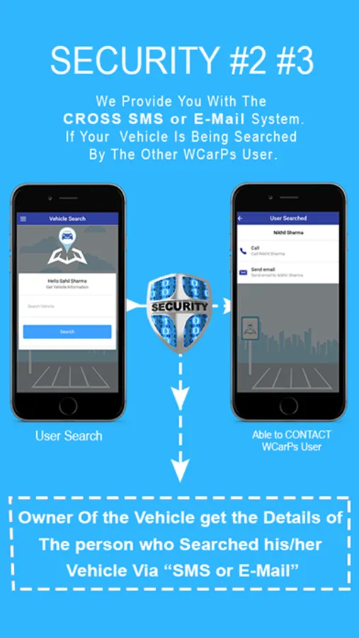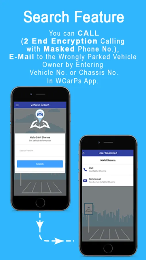 It Provides the Name and an Encrypted Number of the Wrongly Parked Vehicle Owner by Entering His Vehicle No. Or Chassis No. You Can call him With This Encrypted numbers. SMS and Email Will Be sent to him automatically.
