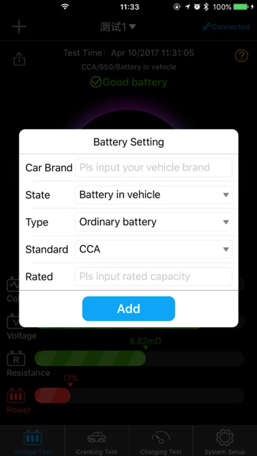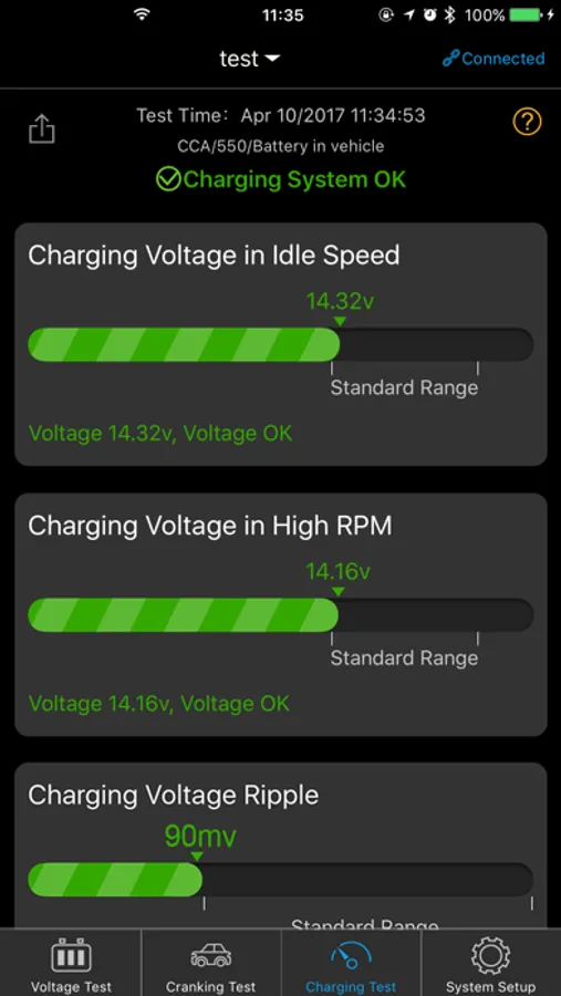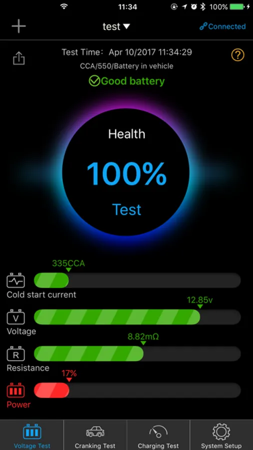Battery Analyzer 200 is the matched app of Bluetooth battery analyzer. It can accurately measure cold start current(CCA), voltage, internal resistance, charge and health percentage of all 12V battery. Besides, it can test vehicle cranking system and charging system. Meanwhile, it can provide share and print of test result. The high accuracy of measurement is the main feature of the product.