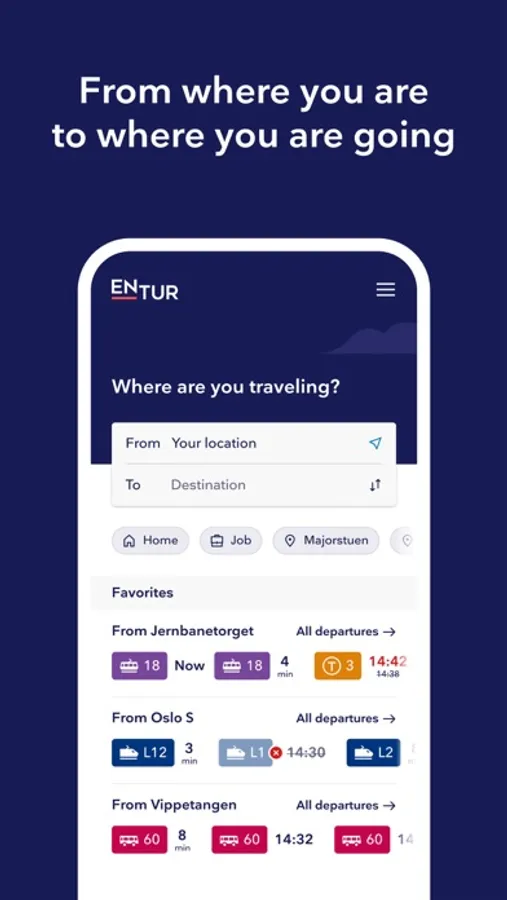 Entur gives you travel suggestions from door to door by bus, train, metro, boat and airplane, either if you want to check when the next bus is leaving from your destination, or if you are planning a vacation from Larvik to Lofoten.