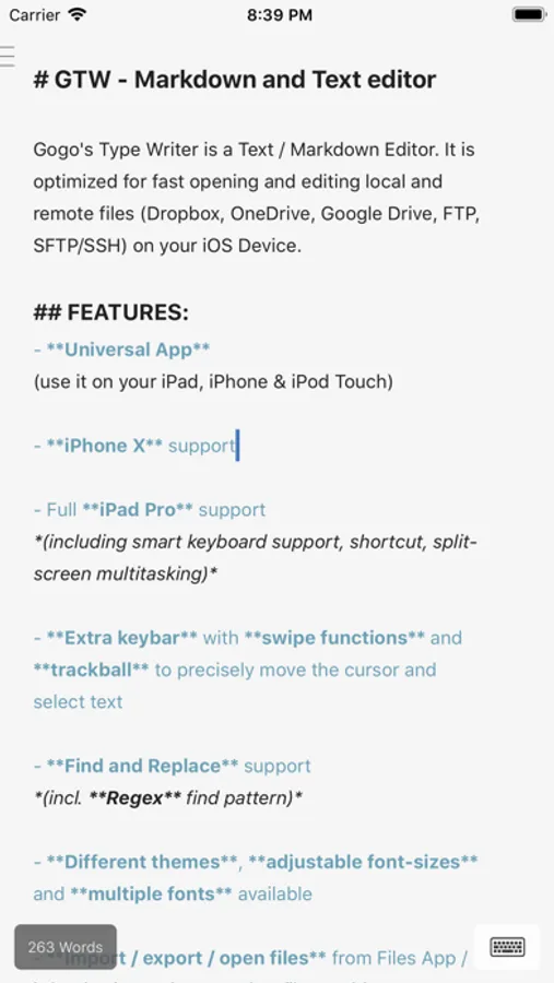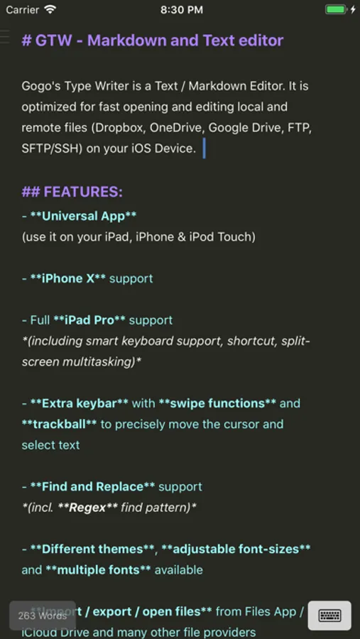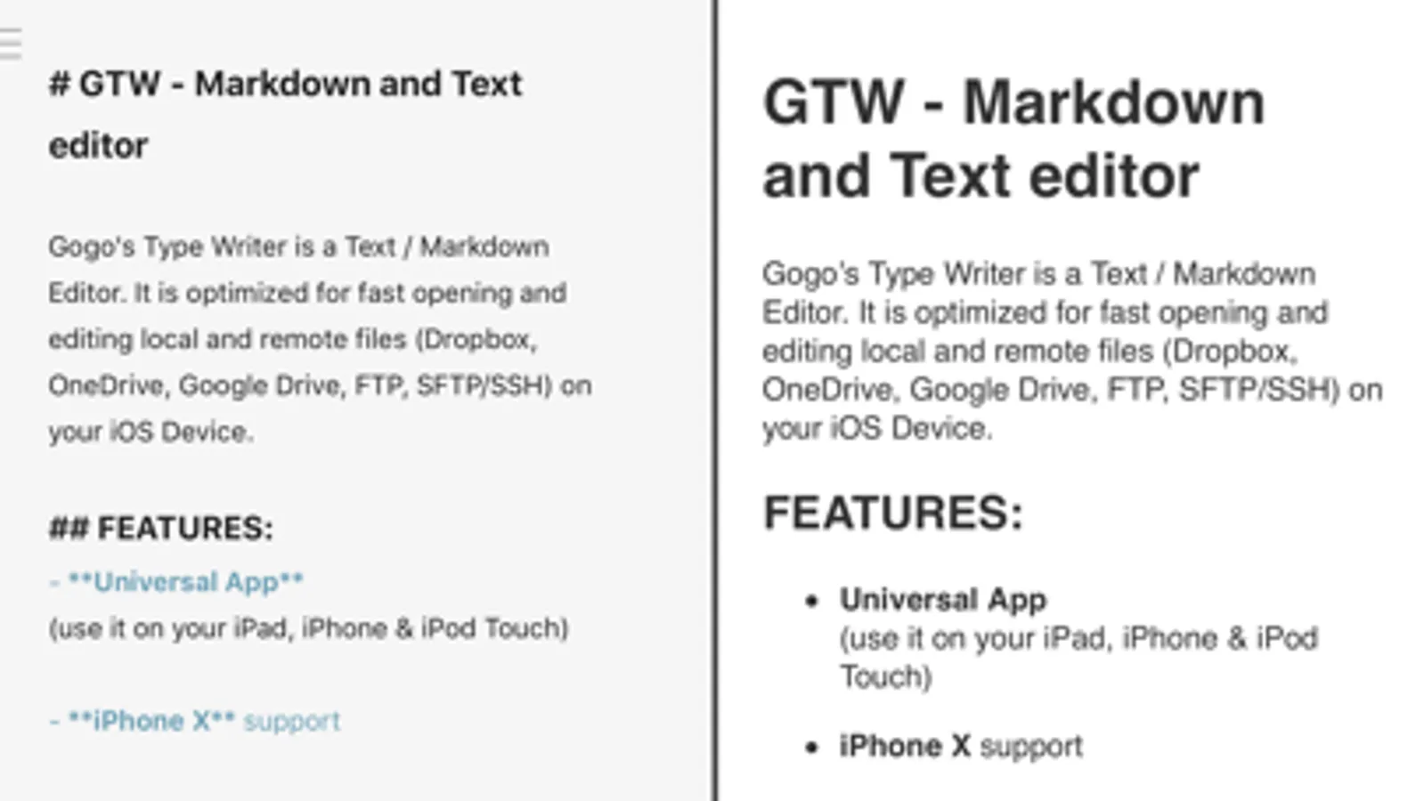 Gogo's Type Writer is a plain Text and Markdown Editor. It is optimized for fast opening and editing local and remote files (Dropbox, OneDrive, Google Drive, FTP, SFTP/SSH) on your iOS Device.