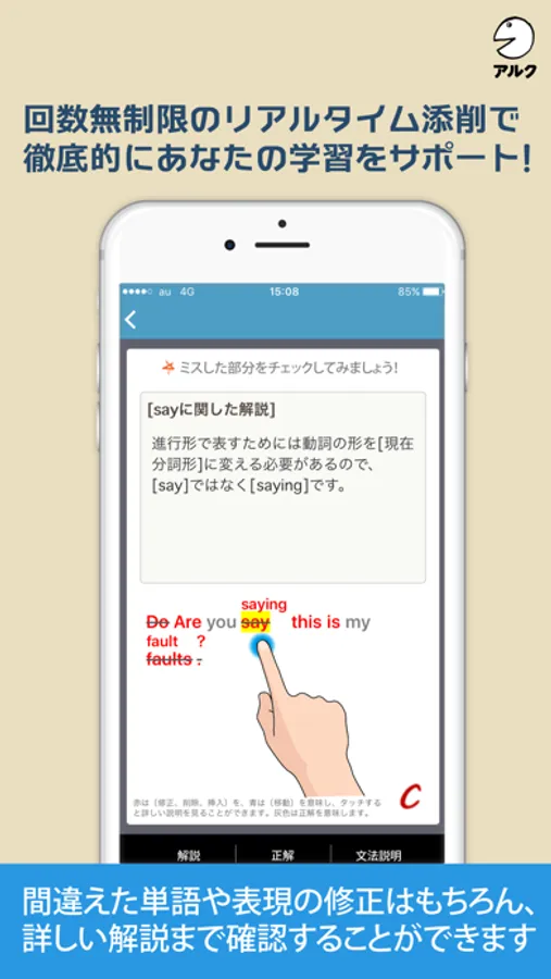 ・ 間違えたスペル、形態、文法、熟語、語順を直してくれるのはもちろん、詳細な解説と文法説明まであります。