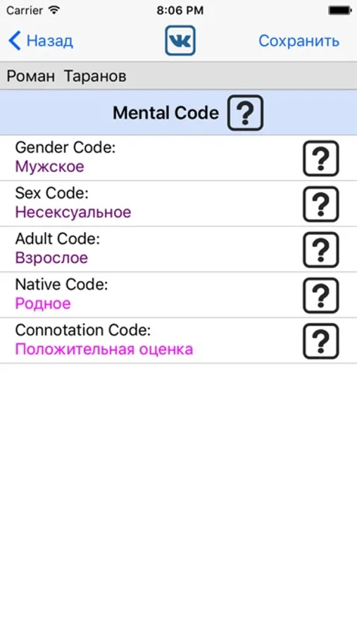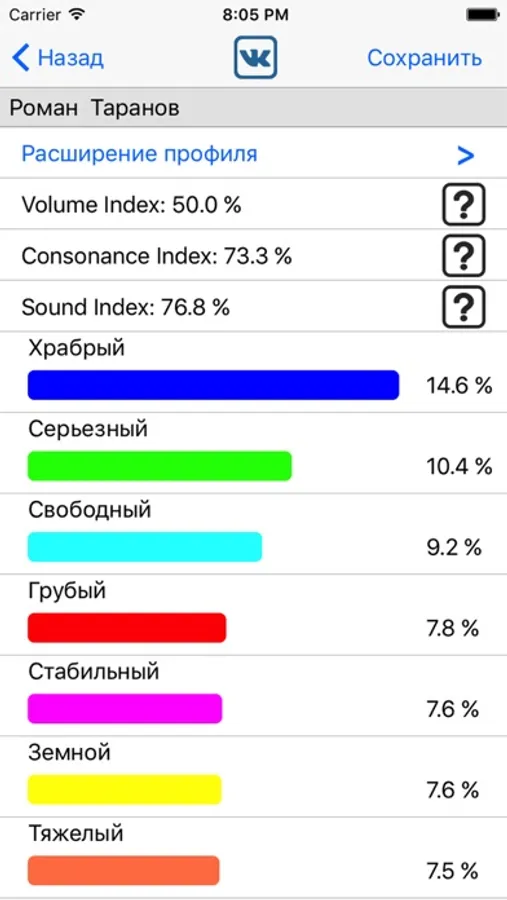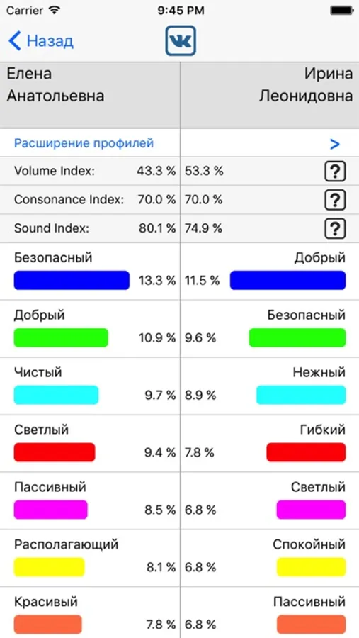 2. Расчет расширения психофонетического профиля значения имени (индексов фоносемантического кода).
