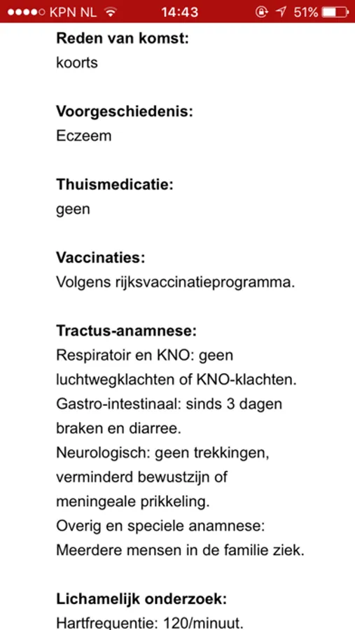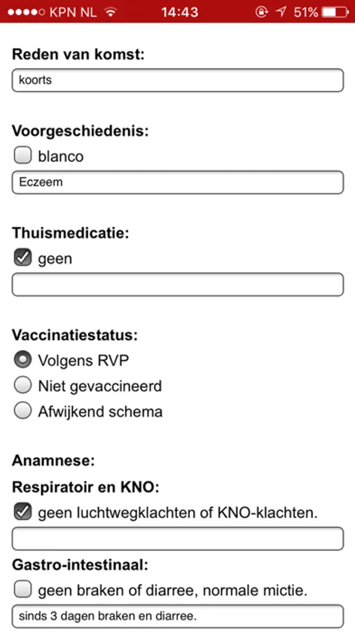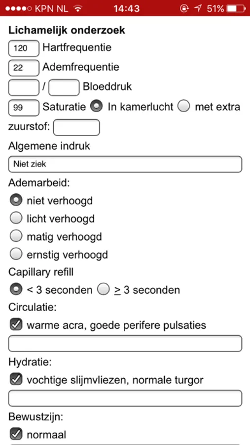 Normale bevindingen bij de anamnese en lichamelijk onderzoek worden automatisch ingevuld, je hoeft alleen nog de afwijkende bevindingen en de conclusie in te vullen.