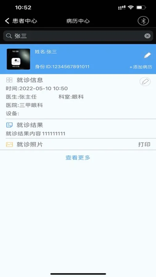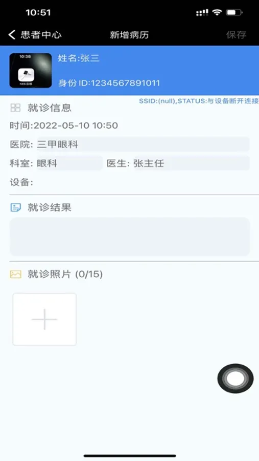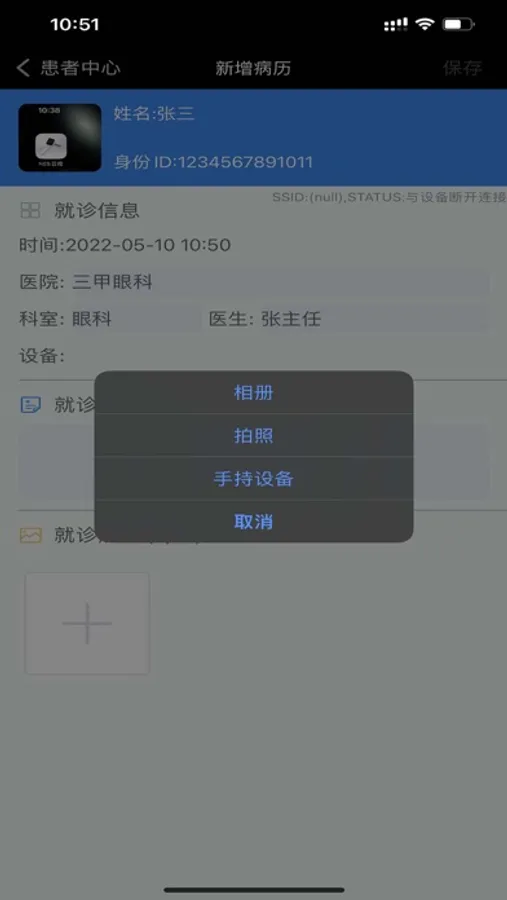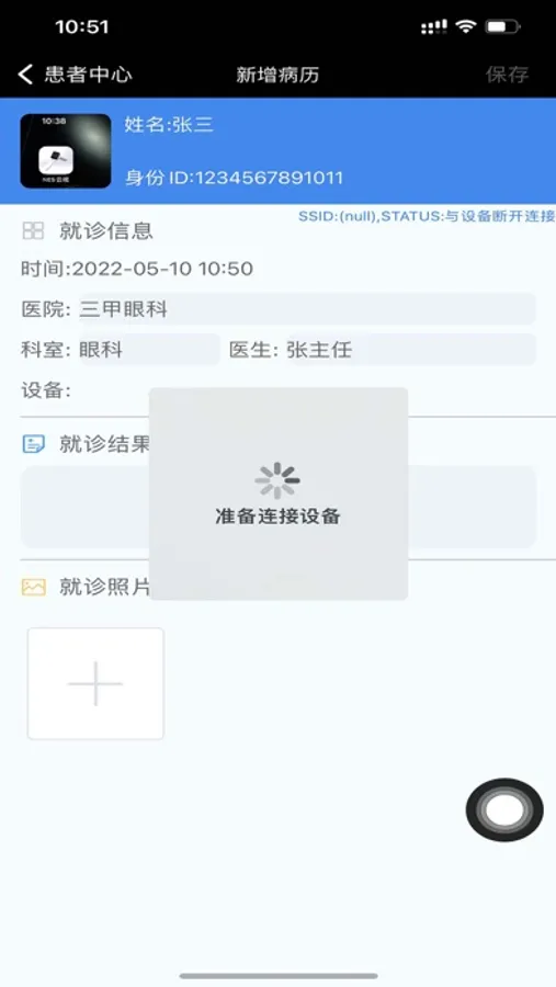 一款用于眼科设备拍照传输的app(型号:A001),利用蓝牙身份识别器与本软件使用平台连接,以实现功能。