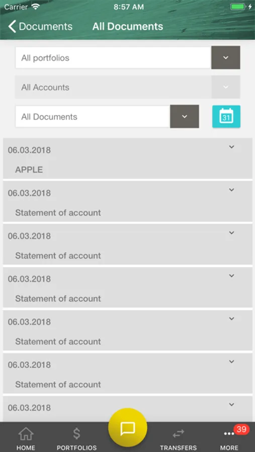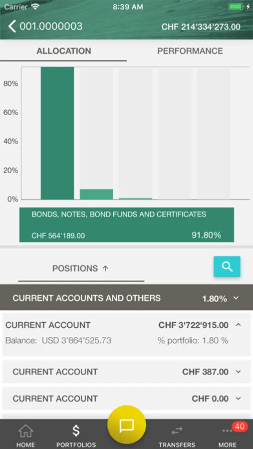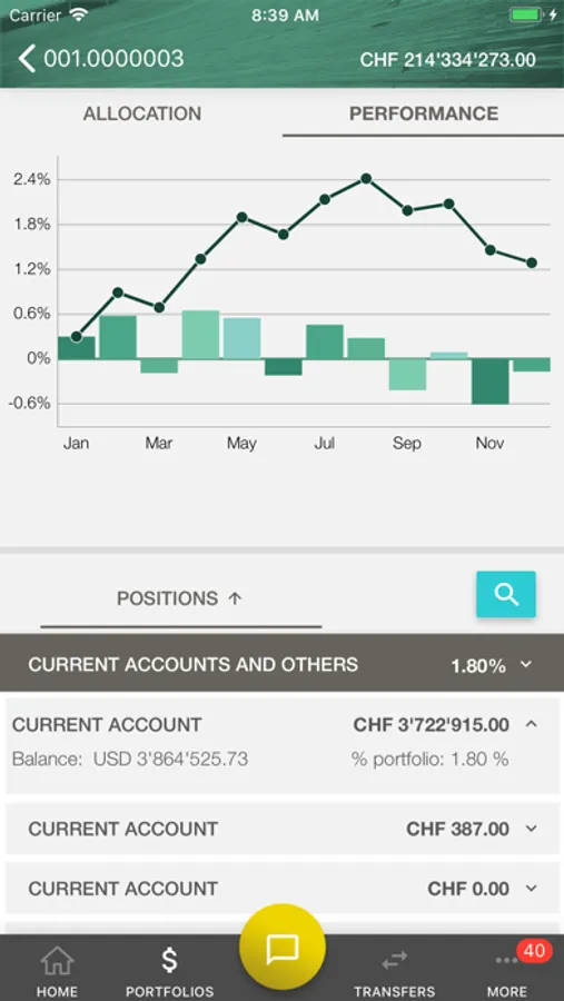 • Portfolio access – by asset type or currency, with performances and transaction lists
