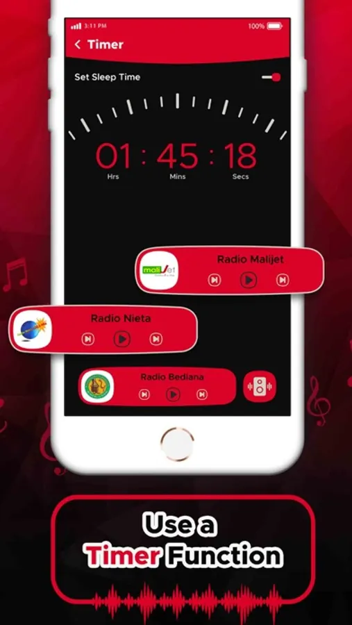 - Provides sleep timer option to turn off the radio playing at the given time.