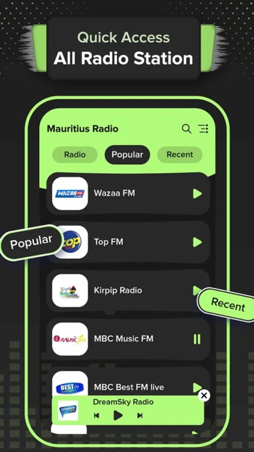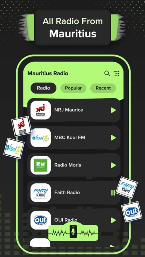 FM Radio Mauritius All Stations is a mobile application that allows its users to listen more radio stations from all over Mauritius.