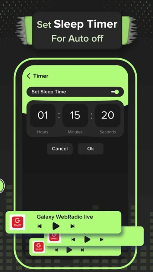 - Provides sleep timer option to turn off the radio playing at the given time.