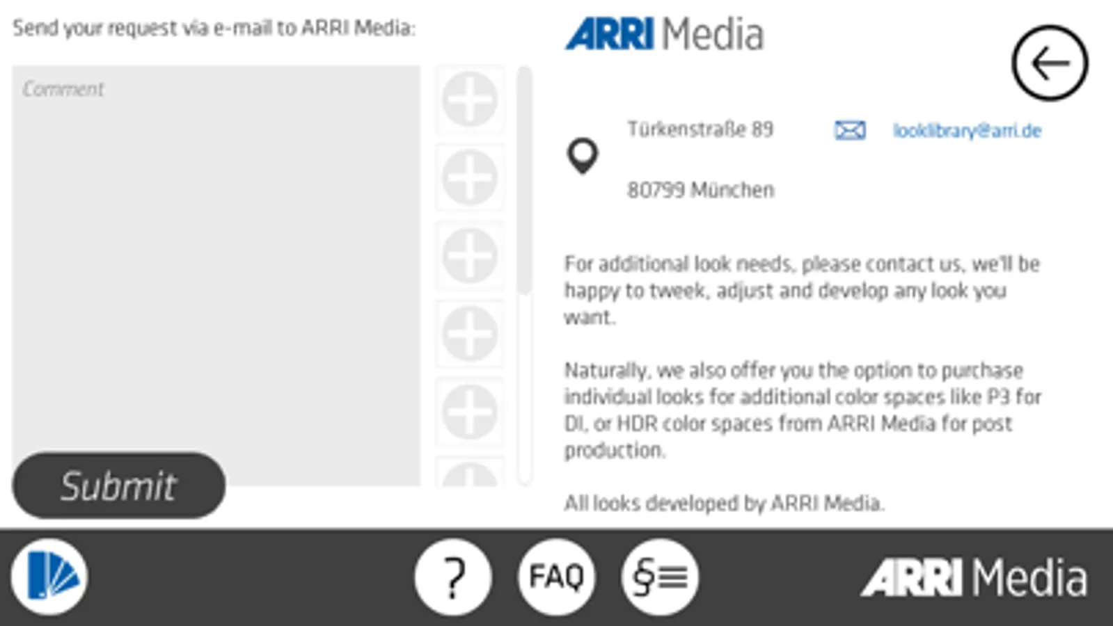 ARRI Media, ARRI’s state-of-the-art postproduction and creative services business, has developed the 87 looks and this accompanying app. You can contact ARRI Media directly if you require adjustments to a look, if you need a completely bespoke look, if you need to work in HDR or P3 color space, or if you have any questions.