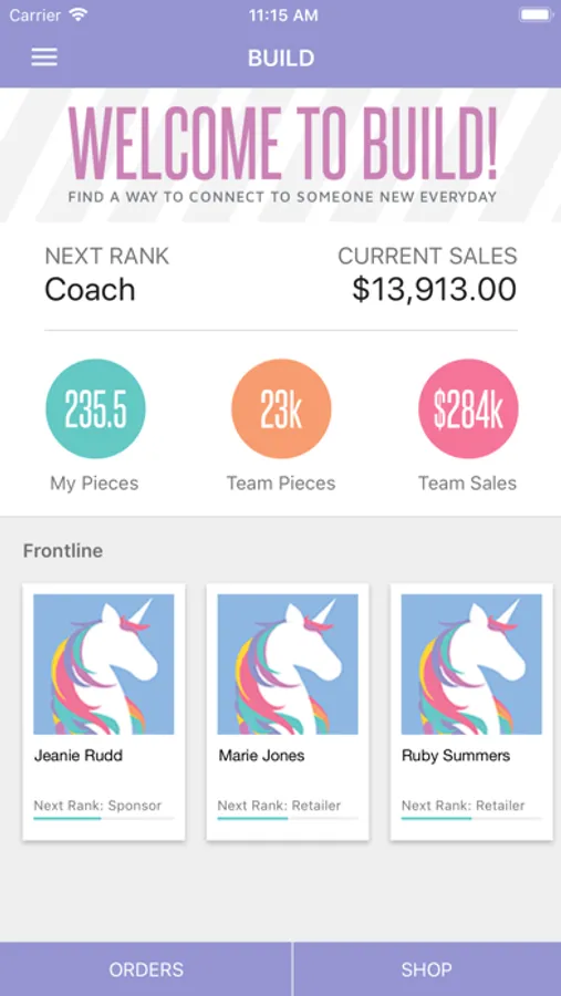 The BUILD mobile app will give you a quick view of your Retailer Dashboard, including your piece counts, T.E.A.M. piece counts, and T.E.A.M. Sales! With the BUILD app you can also easily view all of your wholesale orders, their status, and details. You will even be able to see past bonuses and your progress toward your next rank advancement!