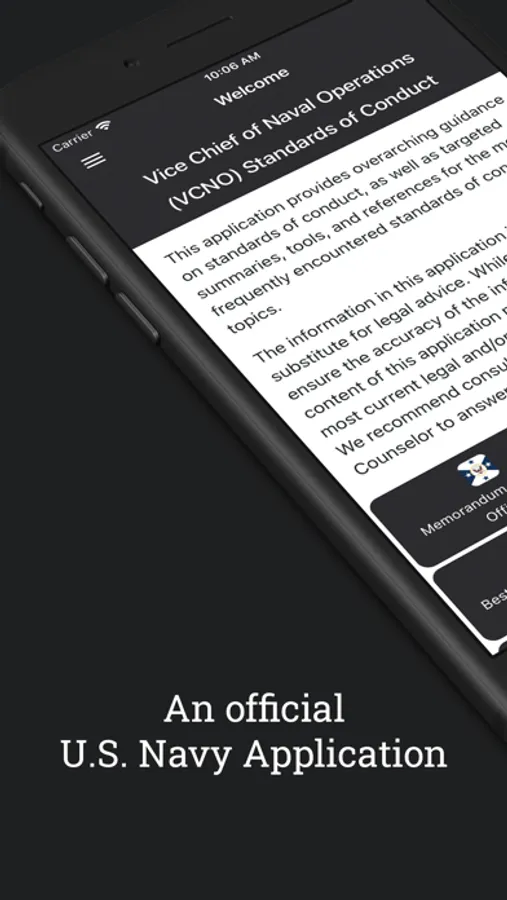 The Vice Chief of Naval Operations (VCNO) Standards of Conduct application is a mobile version of the VCNO's Standards of Conduct Guidance Memorandum for All Flag Officers. It is a resource for officers and their staffs to administer and maintain a comprehensive ethics program. The app provides overarching guidance on Navy Standards of Conduct, targeted summaries, tools and references for the most frequently encountered topics.