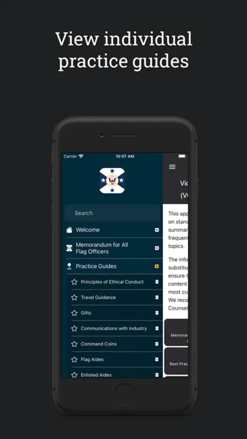The app is also useful for Commanding Officers, Judge Advocates/General Counsel, Ethics Counselors and others. The VCNO's Memorandum for All Flag Officers and various Point Papers compose the bulk of the app's guidance. However, the app also offers Best Practice forms and checklists, as well as dynamic and interactive approaches to help users understand the practical implementation of Standards of Conduct guidance. The application is divided into the following sections for ease of use: