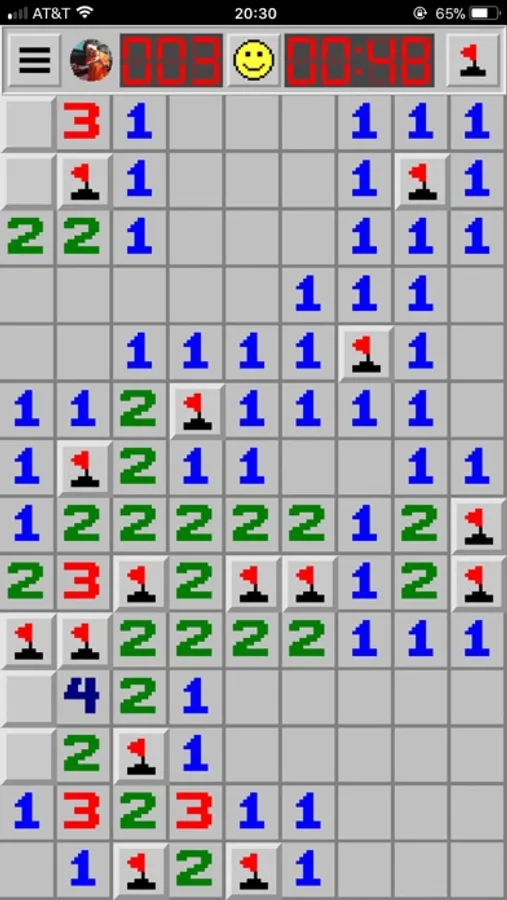 The goal of the game is to uncover all the squares that do not contain mines without being "blown up" by clicking on a square with a mine underneath. The location of the mines is discovered by a process of logic. Clicking on the game board will reveal what is hidden underneath the chosen square or squares (a large number of blank squares may be revealed in one go if they are adjacent to each other). Some squares are blank but some contain numbers (1 to 8), each number being the number of mines adjacent to the uncovered square. To help avoid hitting a mine, the location of a suspected mine can be marked by flagging it with the flag button. The game is won once all blank squares have been uncovered without hitting a mine, any remaining mines not identified by flags being automatically flagged by the iPhone or iPad. However, in the event that a game is lost and the player mistakenly flags a safe square, that square will either appear with a red X (also denoting it as safe).
