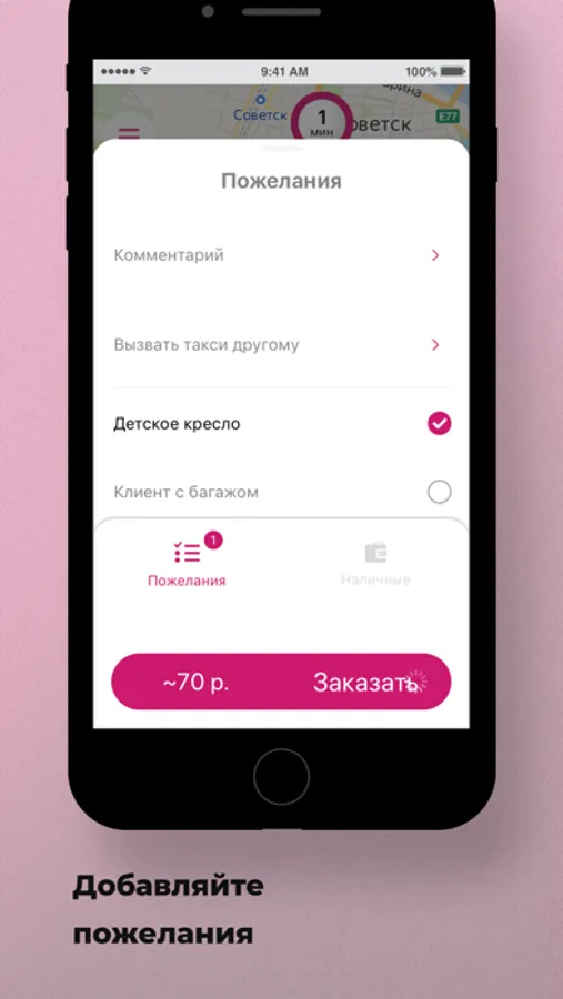 Добавьте к заказу дополнительные пожелания. Например, если едете с ребенком — выберите "детское кресло". Если у вас 2 чемодана и сумки в придачу — укажите "Клиент с багажом". Или выберите “Оплата переводом”, если нет с собой наличных.