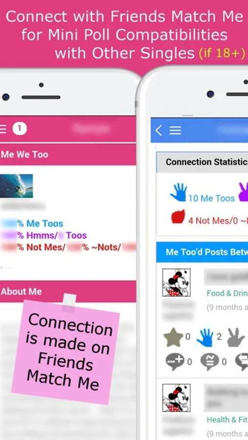 If you're 18 years or older and single, you can connect your Me We Too to the dating app Friends Match Me (connection done on Friends Match Me), to check out your mini poll compatibilites with other single members who have also connected - i.e. your Me Too's/Hmm's/Not Me's on Me We Too posts. Choose on your Me We Too Edit Profile page to also show your Friends Match Me profile/link on your Me We Too profile.