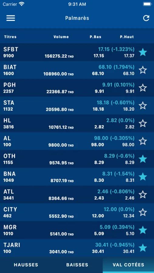 - de suivre le palmarès des hausses/ baisses/volumes