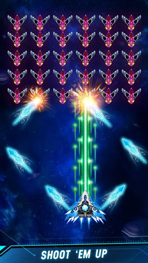 - Perfect Shoot ‘em up: Choose your fighter ship, starship to build your own space team!