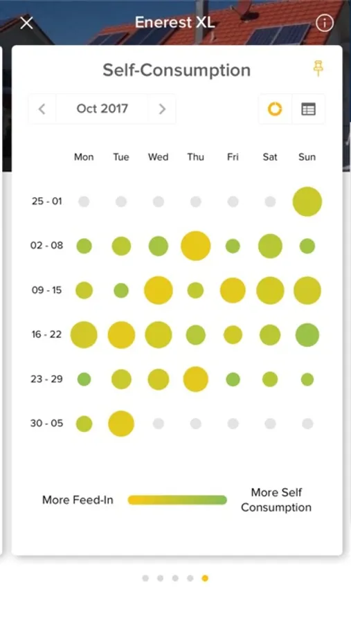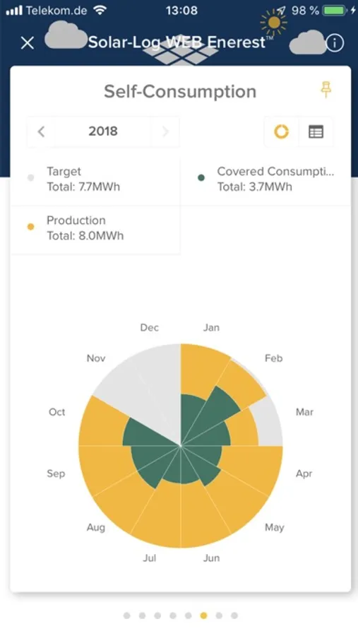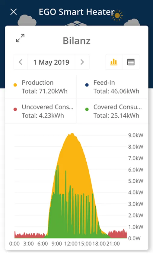 The App concisely presents the production, feed-in, self-consumption and uncovered kWh. These values are also available as a table listing. Current and historical plant data as well as connected components (for example heaters or heat pumps) can be visualized.