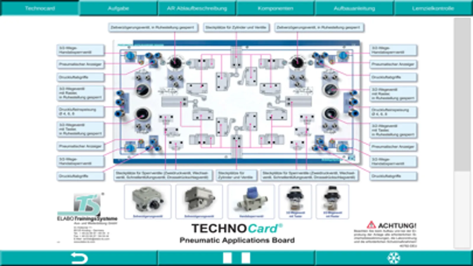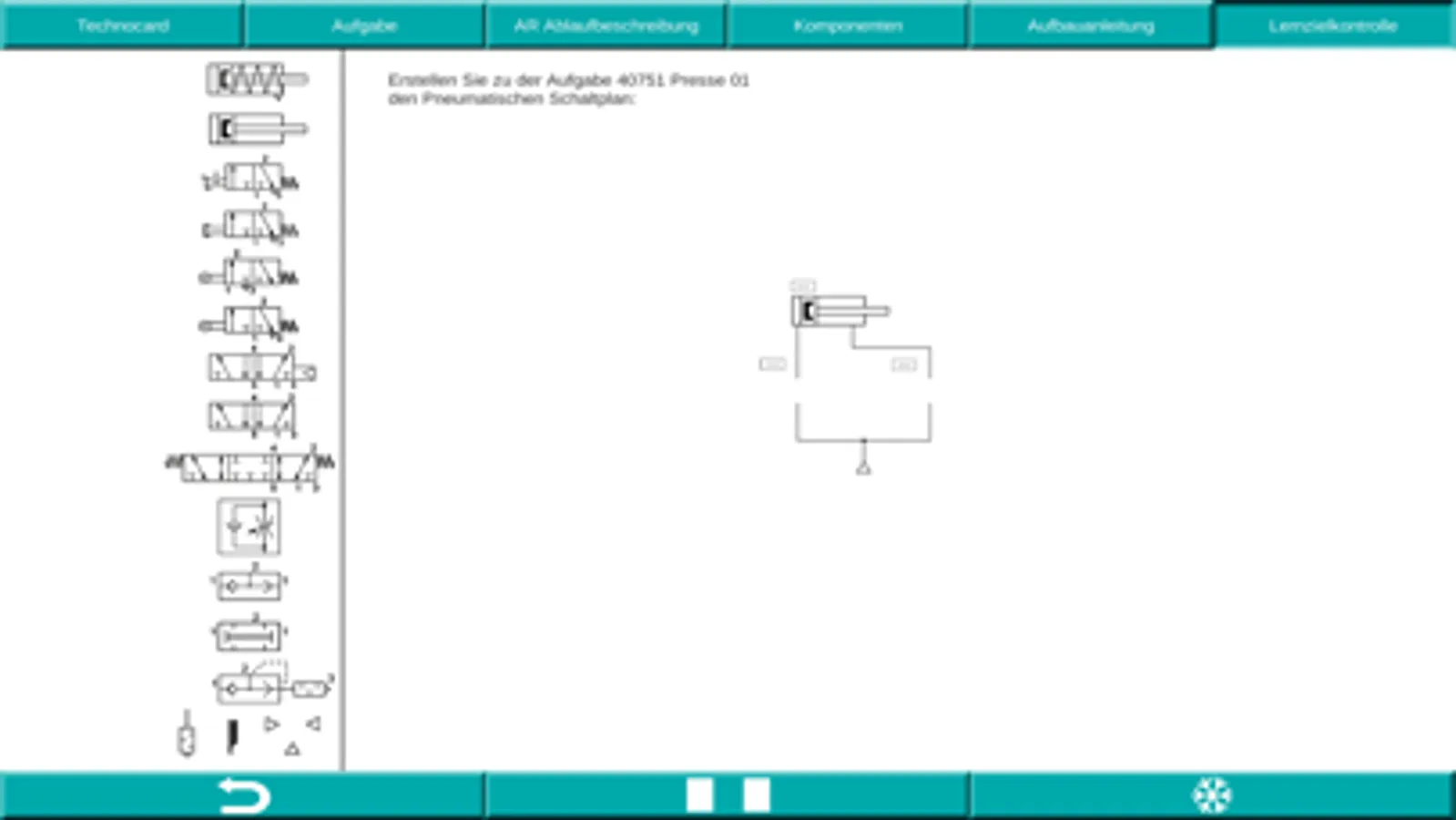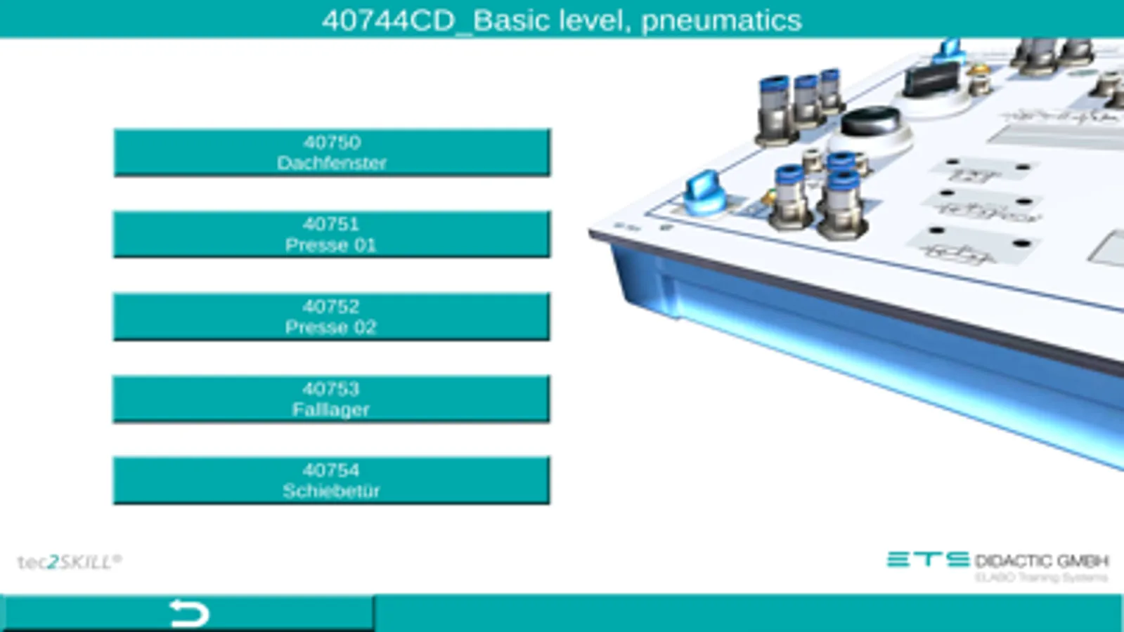 Die Lernanwendung tec2SKILL® Pneumatics ist ein digitaler Assistenten zur didaktischen Unterstützung im Bereich der Pneumatik und der Elektro-Pneumatik. Es wird das Pneumatik und Elektro-Pneumatik Ausbildungssystem von der ETS DIDACTIC GMBH unterstützt.