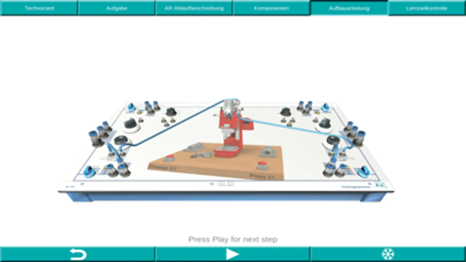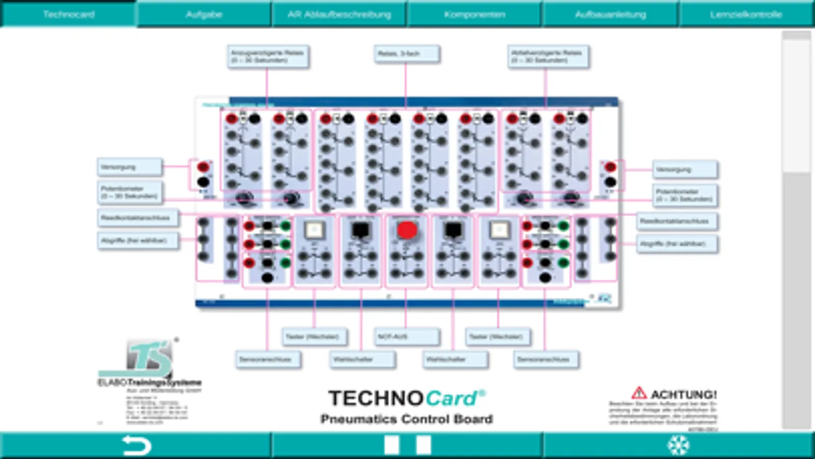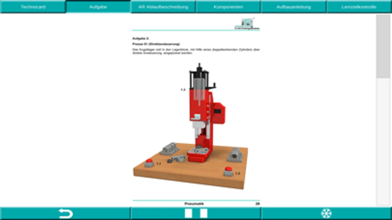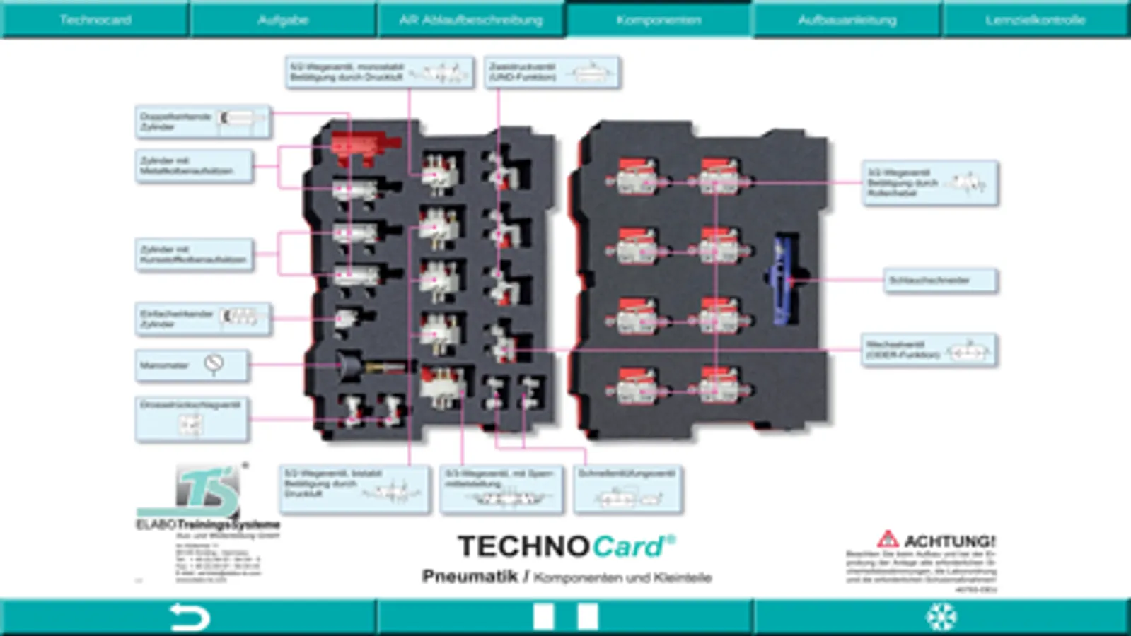 Die Lernanwendung tec2SKILL® Pneumatics ist ein digitaler Assistenten zur didaktischen Unterstützung im Bereich der Pneumatik und der Elektro-Pneumatik. Es wird das Pneumatik und Elektro-Pneumatik Ausbildungssystem von der ETS DIDACTIC GMBH unterstützt.