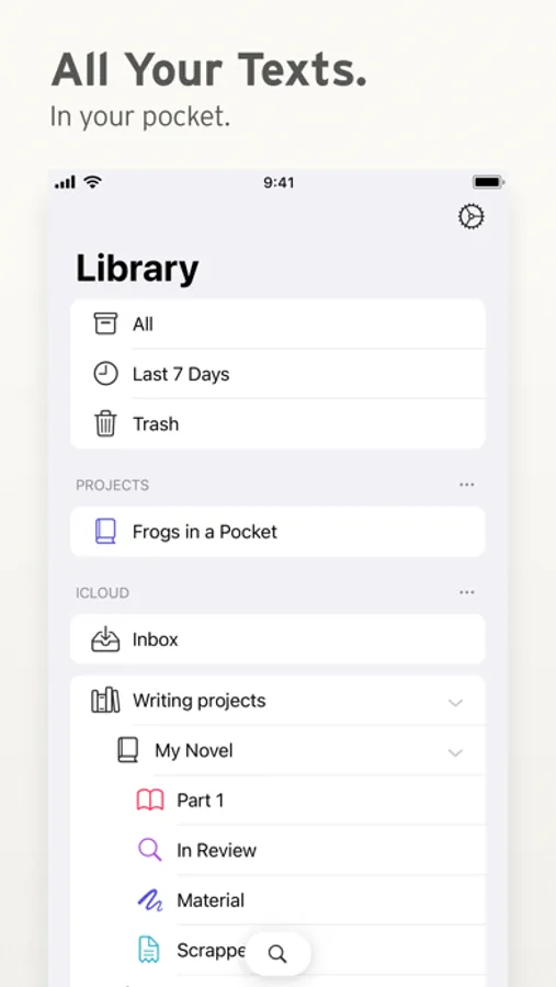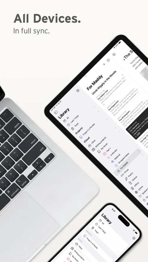 Everything you’ll ever write is stored in Ulysses’ unified library. You can manage projects of all kinds and sizes, be it novels, diaries or study notes – they are always saved, and automatically in sync. And since Ulysses offers feature parity across macOS and iOS, it doesn’t matter where you are or when inspiration hits: All its tools, and all your texts, are always at your fingertips.