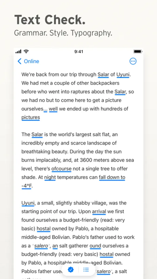 Write with confidence, thanks to Ulysses’ integrated grammar and style check. Available for over 20 languages, it analyzes your text and offers informed suggestions for capitalization, punctuation, semantics, redundancy, style and more.