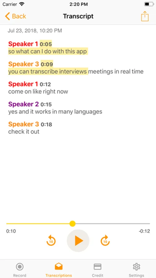 • Gives you timestamps for every word. Tap a word and the player moves to that spot in the recording.