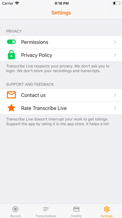 • Respects you privacy. You never have to log in. We don't save your transcriptions on our servers and we don't sell you out to third-party advertisers. Everything is saved on your device and is under your control.