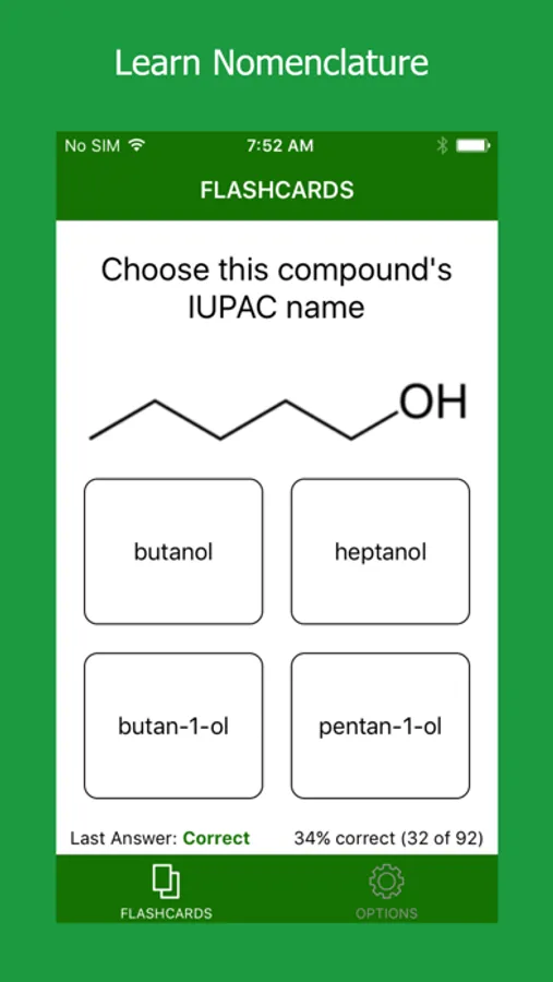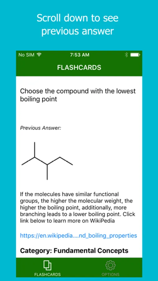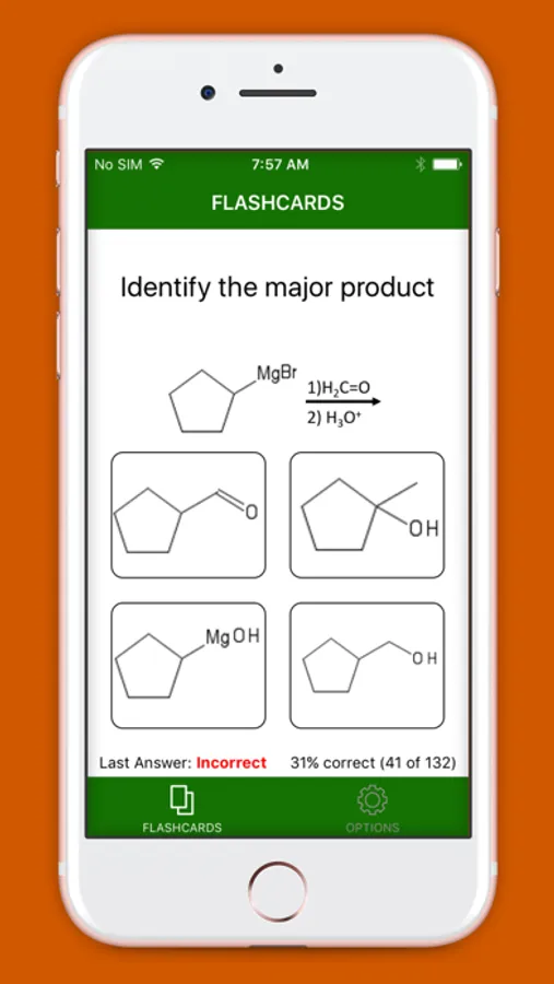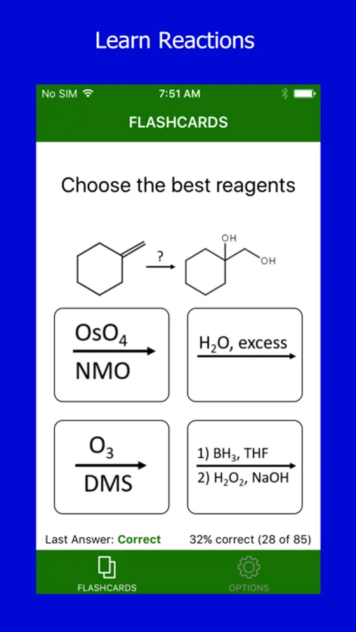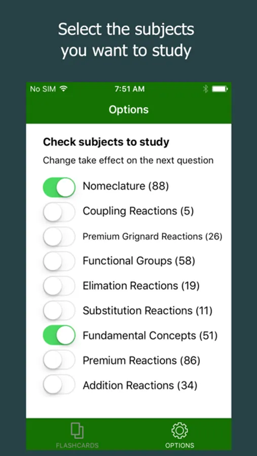 The subjects can be filtered out on the options tab (accessible by swiping right) so you only study the subjects you need to. For example, if you only want to study organic chemistry reactions, just select those categories. Your organic chemistry subject selections save across restarts so you are ready to go right when you open the app.
