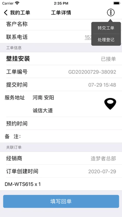 一款方便安装工人工作的app,拥有接单,查看工单,转交工单,问题提交,结单,查看历史工单,销售开单,上下班打卡,查看地图等功能。