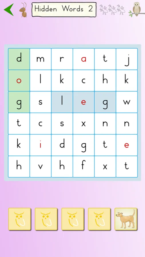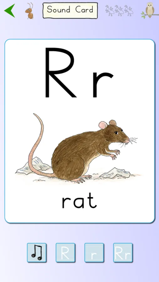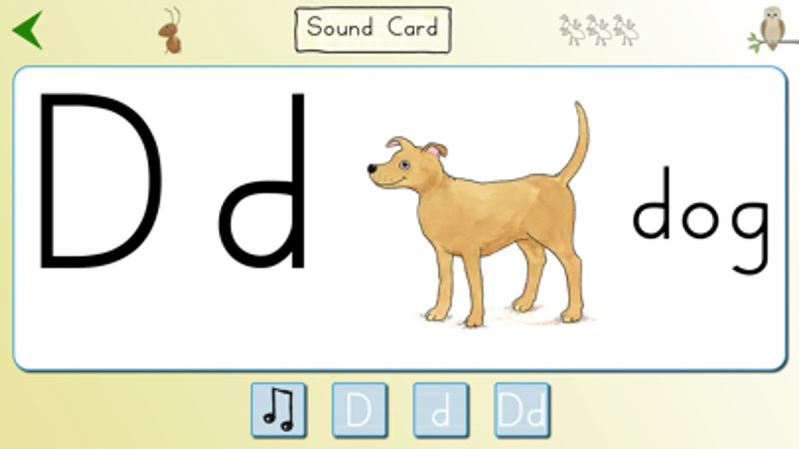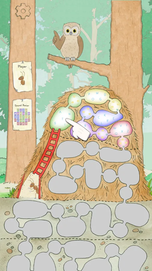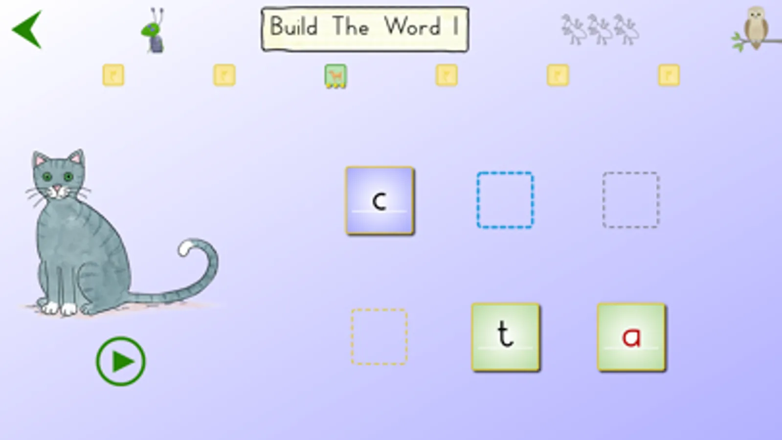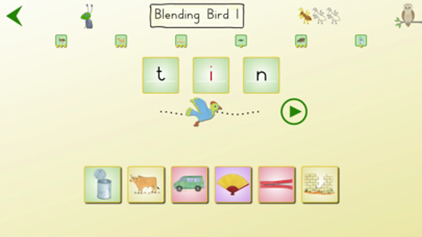 Finishing a group of sounds opens up a new room with games, where the new skills are used. Blending of sounds into words starts when the first two groups of sounds are completed. The technique is illustrated by a blending bird, which can also be dragged manually for additional training.