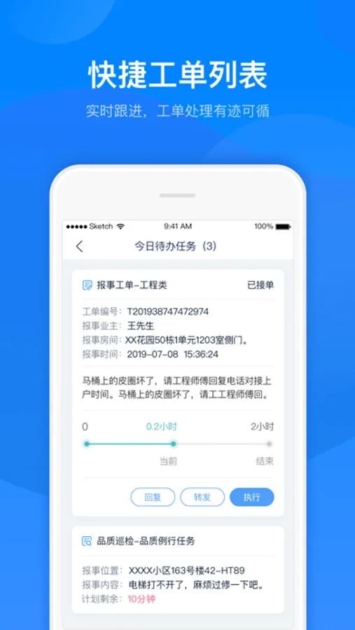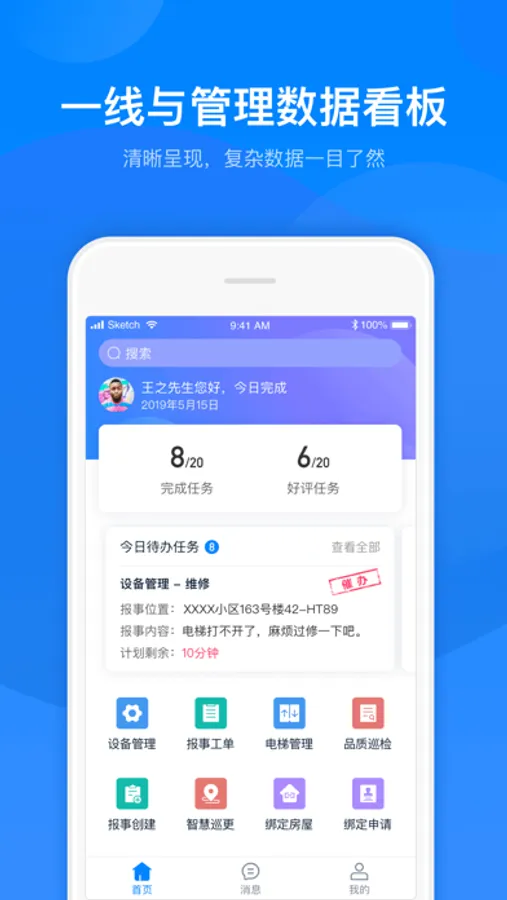 报事工单、报事创建、智慧巡更、品质巡检、设备管理、电梯管理、离线数据、基础数据、新闻公告、业主画像、移动考勤、设备数据、绑定申请、绑定房屋、绑定NFC。