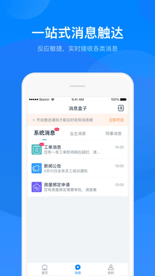 重点功能包括:IM沟通、通讯录、工作台、移动工作简报以及15款物业服务管理应用。