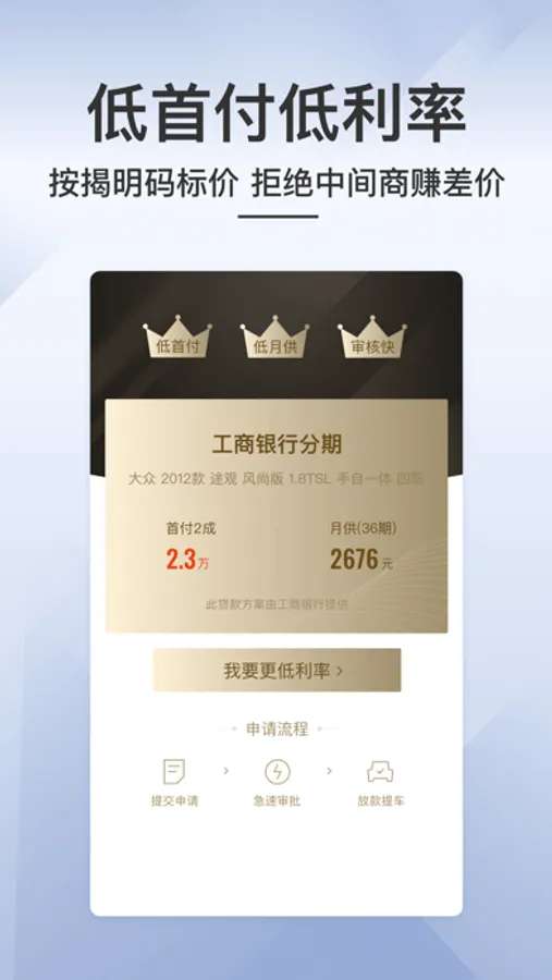 多种金融方案任选,低门槛低首付低利率,秒速放款当天提车,按揭费用明码标价,拒绝中间商赚差价!