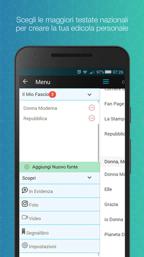 Ad esempio, volete informazioni legate al mondo femminile? Selezionate la categoria “Donna, Moda” e poi le fonti che preferite: Donna Moderna, Elle, Grazia, io Donna, Pianeta Donna…