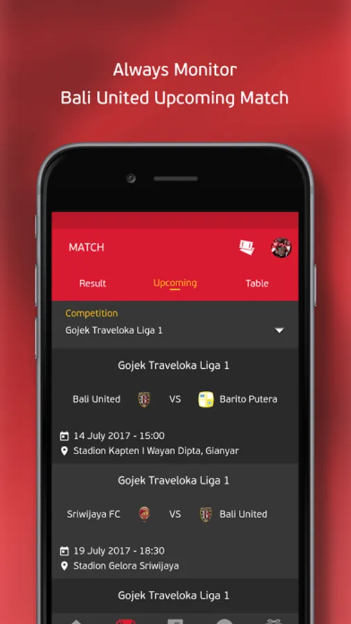 With Bali United Official App you won't miss the whole match of Bali United through Match Result features and Match Fixtures feature that can help you to keep track of the Bali United match.