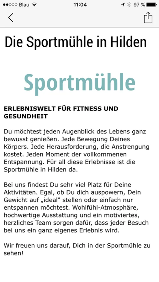 Mit der Sportmühle-App hast Du Deine Sportmühle Hilden immer in der Hosentasche. Informationen, wie z.B. das aktuelle Kursprogramm, die nächsten Events, Clubfotos und Angebote sind immer dabei und Du erhältst alle News per Push Nachricht.