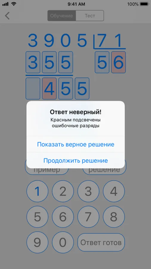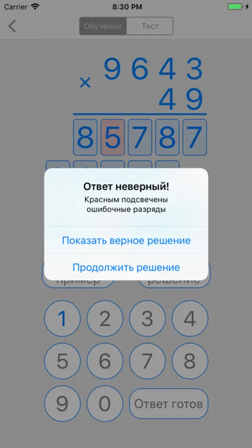 - анализ правильности введённого пользователем решения с выделением неверно введённых при решении цифр;
