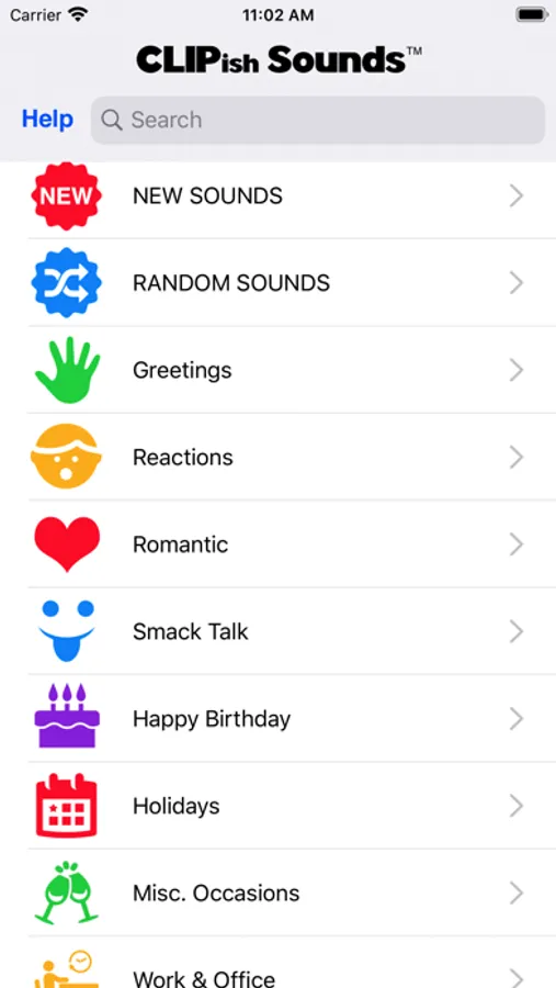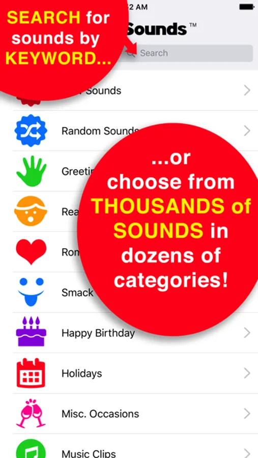 Choose from hundreds of sounds in dozens of categories, including: Greetings, Reactions, Romantic, Smack Talk, Birthdays, Holidays, Sound Effects, Animals, Sports, Politics, Weather, and many more.