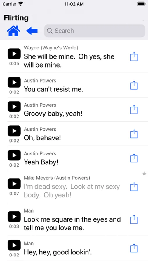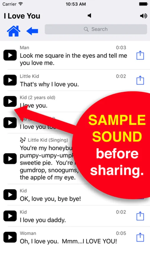 3. Tap the play button to hear the sound. When you find a sound you want to send via text message, tap the Share button for that sound.