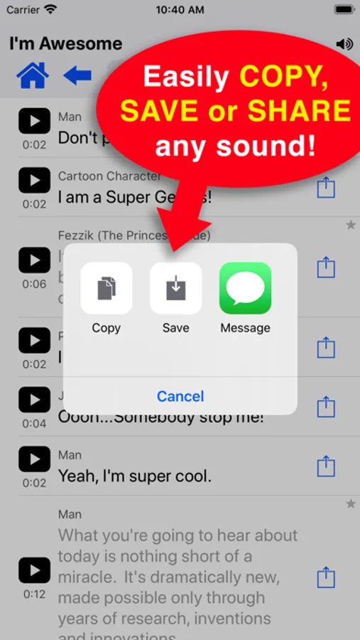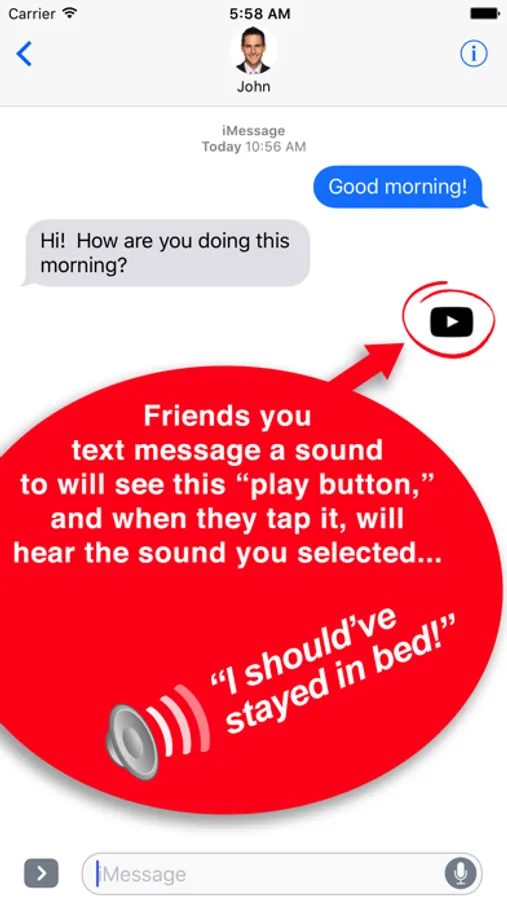Make your text messages and emails come to life! Quickly insert hundreds of fun "sounds" into your messages. The person you send the sound to will see a small "play button," right in the message. When that user taps on the play button, they will hear the sound you've selected for them.