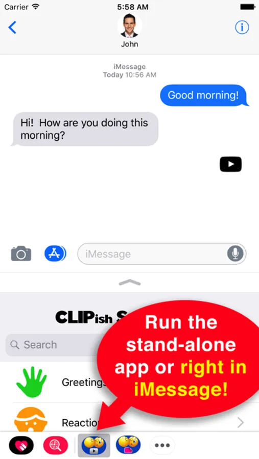 1. Tap the App button in iMessage to find and run the CLIPish Sounds iMessage app.