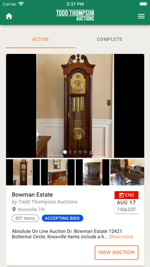 Todd Thompson Auctions has 25 years of experience in selling real estate and tangible personal property at live auction venues and online auctions. This dynamic app allows you to (1) stay informed about our upcoming auctions; (2) watch items that interest you; (3) get notifications when you've been outbid; (4) bid in our auctions no matter where you have to be (or set and forget your maximum bid to let our platform automatically bid the lowest possible winning bid for you). This is the go-to-source for up-to-the-minute information on all of Todd Thompson's auctions.