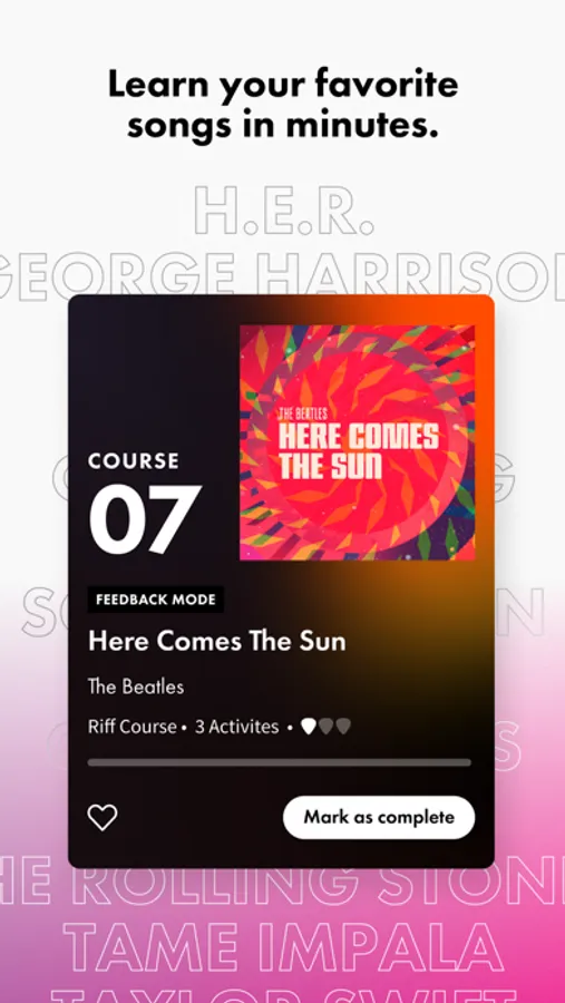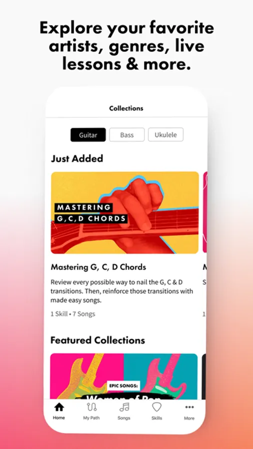 • Collections. Browse through curated collections of songs to learn organized by artist, genre, difficulty and technique.