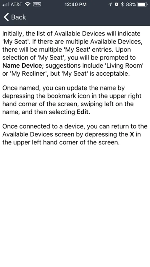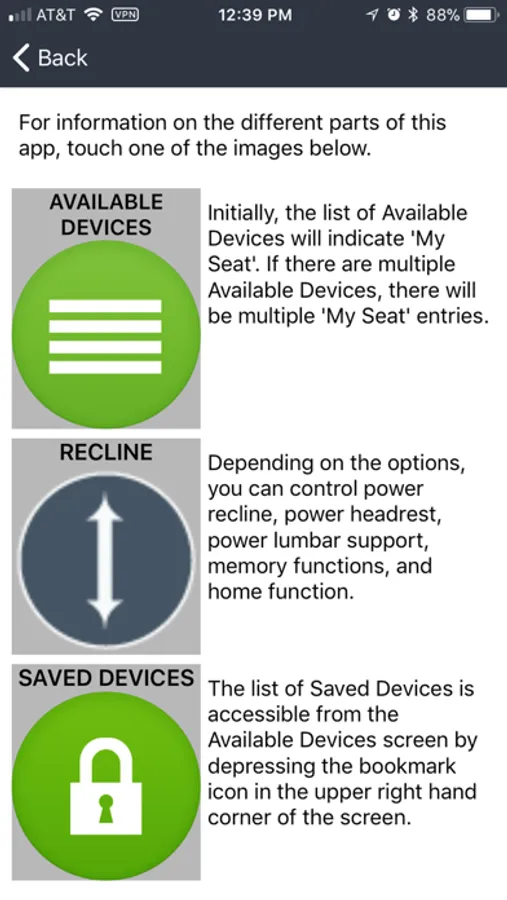 The app allows you to connect to your enabled furniture via Bluetooth from your iPhone or iPad. Depending on the options, you can control the electric motors that move your chair or sofa and may include power recline, power headrest, power lumbar support, memory functions, home function, light, cooling cup, heat, and massage.
