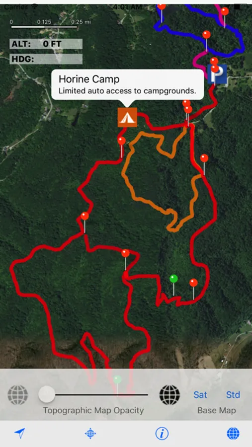 Included on the map are all parking locations, campsites and all trail markers. The user can switch between topographic and satellite base maps.