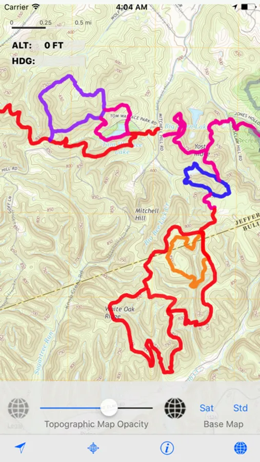 JMF Trails is designed to show the trail system at Jefferson Memorial Forest, located in Louisville, Kentucky. The app uses detailed 7.5-minute topographic maps (showing 10-foot elevation contour lines) as a background for over 35 miles of trails. The maps are incredibly accurate and helpful for hiking, trail running and orienteering. The app also uses the location services (GPS), when available, to show the user location on the trail, altitude (above sea level) and magnetic heading. For those new to the JMF trail system, this is an excellent tool for becoming familiar with the more than 35 miles of beautiful trails in this forest.
